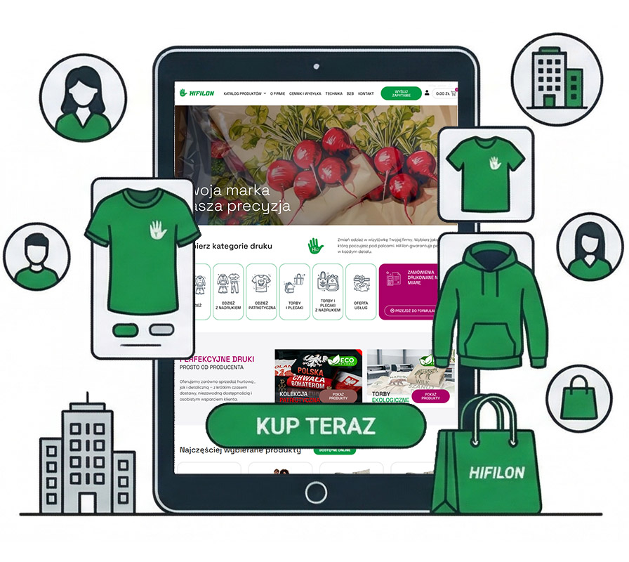 Hifilon – Drukarnia Tekstylna to miejsce, gdzie wizerunek Twojej firmy nabiera realnych kształtów. Profesjonalny wygląd jest kluczem do budowania zaufania, dlatego rozumiemy, że odzież i akcesoria z nadrukiem to nie tylko produkty, ale przede wszystkim wizytówka Twojej marki, pasji lub przekonań.